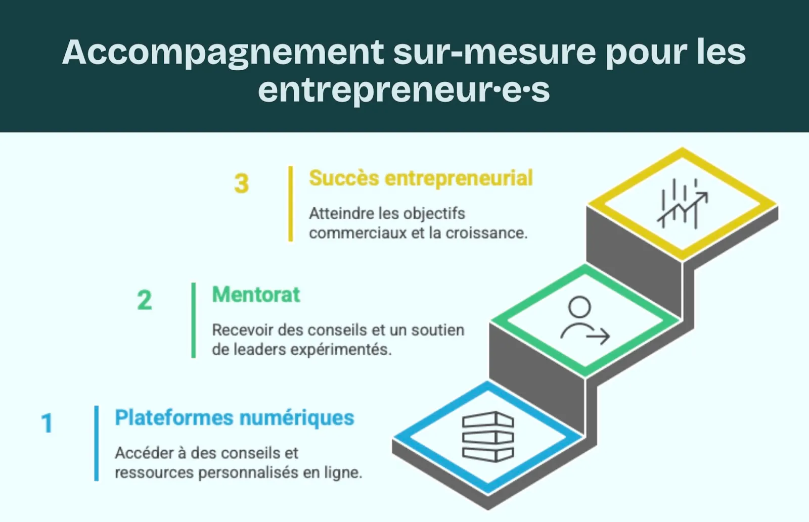 Le développement du mentorat et du parrainage est également encouragé, afin que vous puissiez bénéficier de l’expérience et du soutien de dirigeant·e·s plus aguerri·e·s, renforçant ainsi vos chances de réussite.