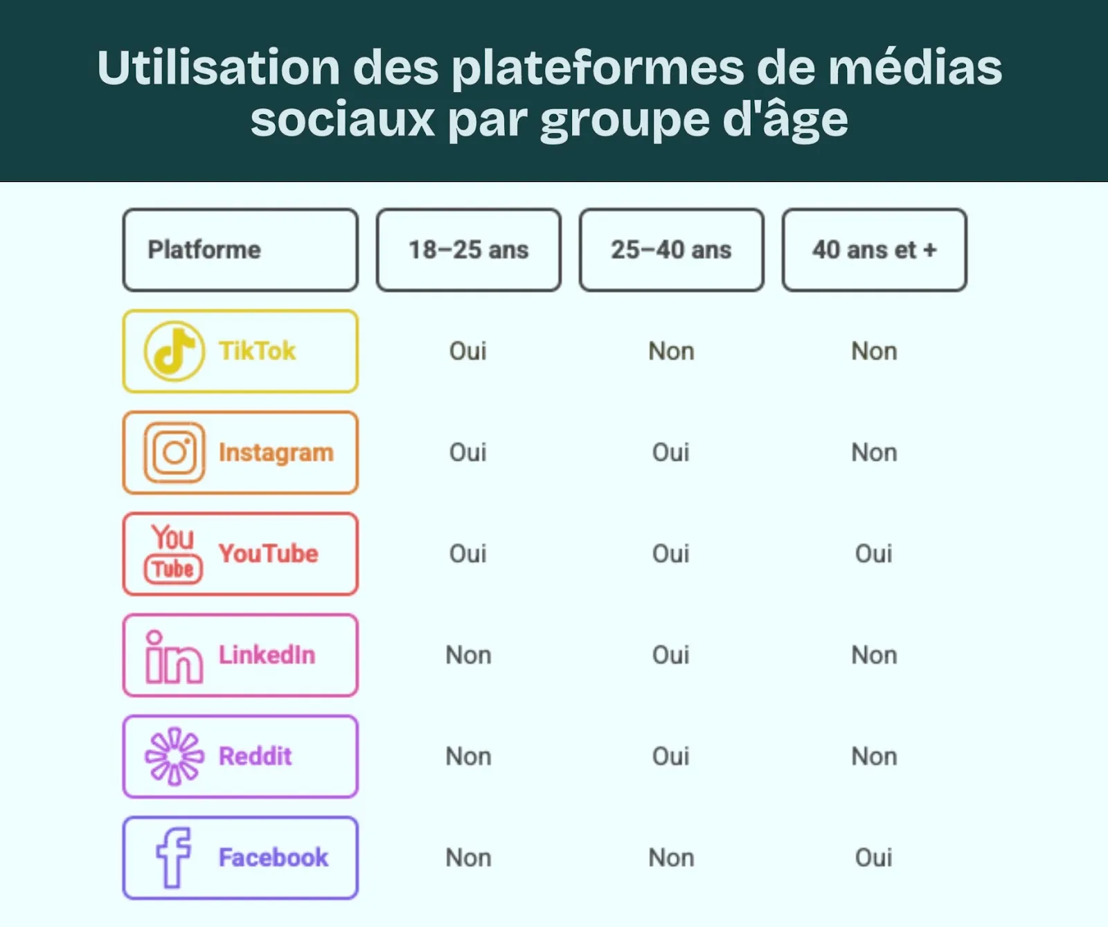 - Les 25–40 ans utilisent également LinkedIn et Reddit.