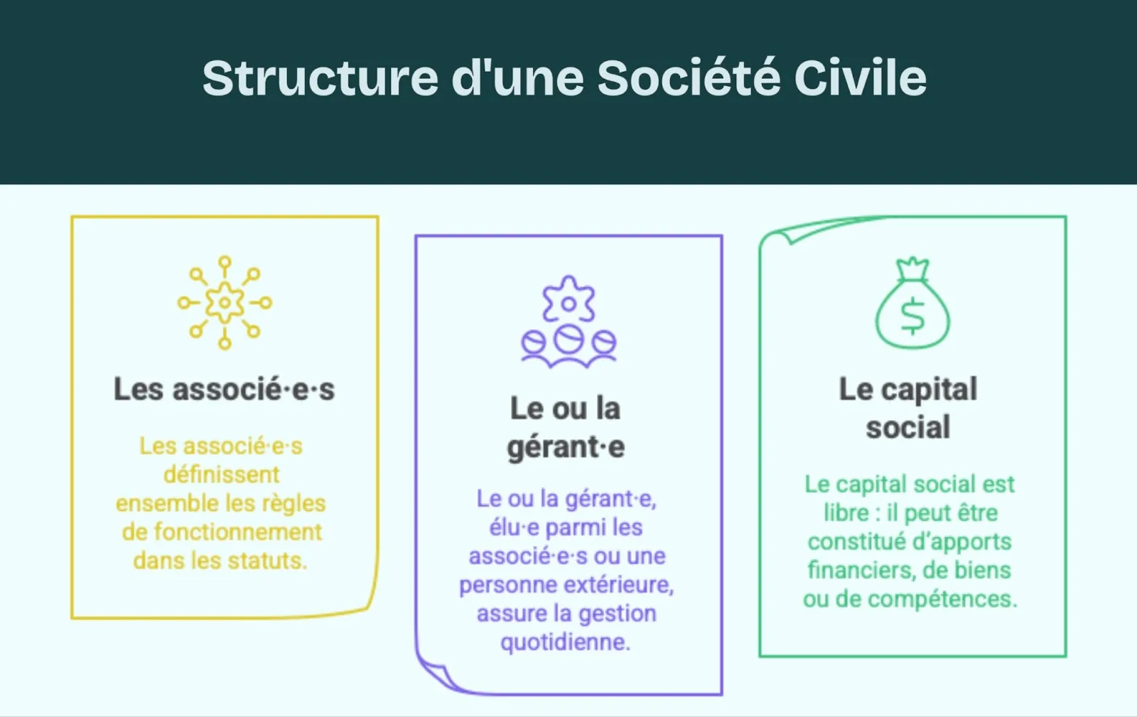 - Le ou la gérant·e, élu·e parmi les associé·e·s ou une personne extérieure, assure la gestion quotidienne.